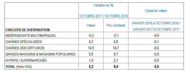 Les premiers résultats du mois d’octobre 2018 indiquent une hausse des ventes des distributeurs de 5,2 % en valeur par rapport à octobre 2017. Pour rappel, la référence d’octobre 2017 s’était cependant inscrite en baisse de 14,2 % par rapport à octobre 2016.