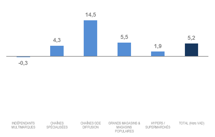 Les évolutions sont comprises entre une hausse de 14,5 % pour les chaînes grande diffusion et un repli de 0,3 % pour les indépendants multimarques.
