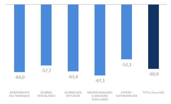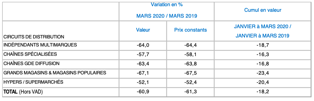 Au total, pour l’ensemble des circuits de distribution (hors VAD), les chiffres d’affaires – ventes en ligne comprises – ont chuté de 60,9 % au cours du troisième mois de l’année.