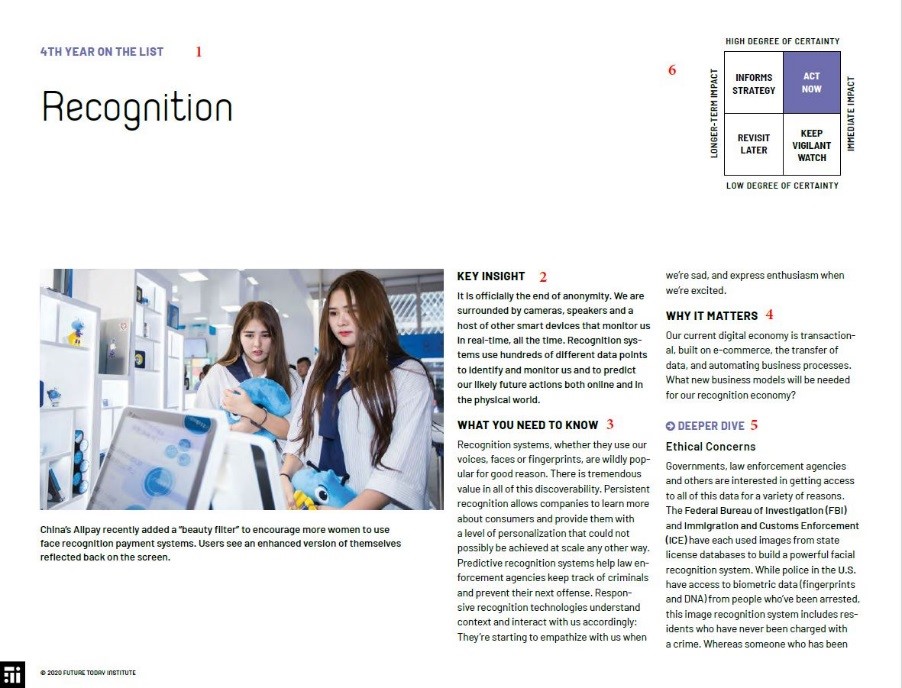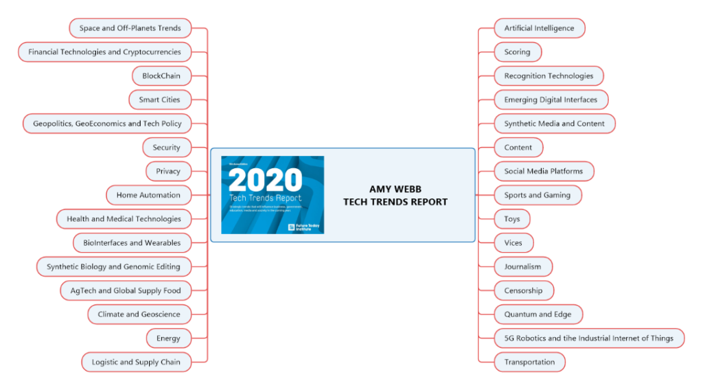 Le rapport d’Amy Webb « TECH TRENDS REPORT » est une référence chaque année. Il est disponible sur le site du Future Today Institute : https://futuretodayinstitute.com/2020-tech-trends/.