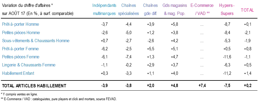 Les résultats du mois d’août sont compris entre une croissance de 7,4 % pour le E-commerce / VAD et un retrait de 7,5 % pour les hypers-supermarchés.