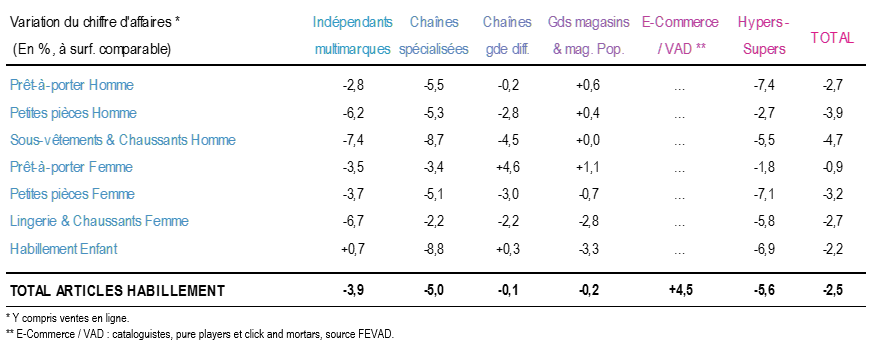 Au total, pour les huit premiers mois de l’année 2018, le bilan des ventes d’habillement affiche un recul en valeur de 2,5 % par rapport à janvier-août 2017.