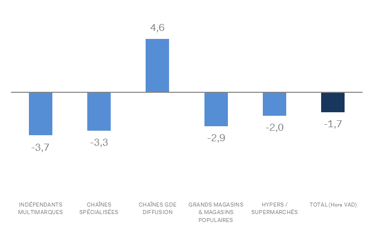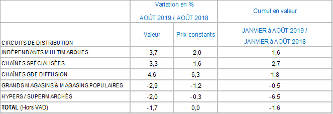 Les résultats du huitième mois de l’année sont compris entre une croissance des ventes de 4,6 % pour les chaînes grande diffusion et un recul de 3,7 % pour les indépendants multimarques.