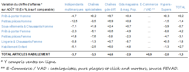 Les résultats définitifs du mois d’août 2019 indiquent un repli des ventes d’articles d’habillement des distributeurs : – 1,3 % en valeur par rapport à août 2018. Pour rappel, la référence d’août 2018 s’était inscrite en légère hausse par rapport à celle d’août 2017 (+ 0,2 % par rapport à août 2017).