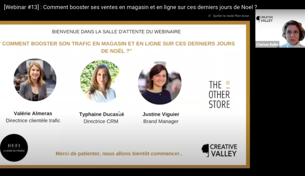 Lundi 14 décembre a eu lieu le dernier atelier de notre série de wébinaires lancée avec Creative Valley lors du premier confinement. Le thème de l’atelier animé par les expert de The Other Store (Valérie Almeras, directrice clientèle trafic, Typhaine Ducassé, Directrice CRM et Justine Viguier, brand manager) était de circonstance : comment booster son trafic en magasin et en ligne les derniers jours avant Noël ?