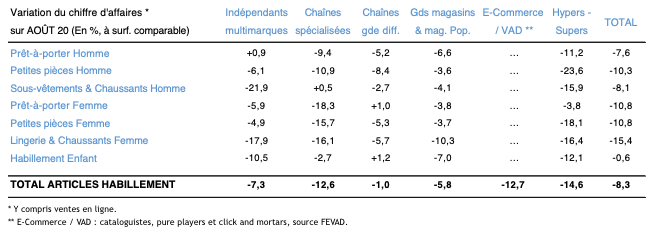 Au total, pour les huit premiers mois de l’année 2021, les ventes d’habillement ont enregistré une progression de 6,2 % en valeur par rapport à la même période de 2020 mais elles restent très en retrait par rapport aux huit premiers mois de l’année 2019 (- 14,8 %).
