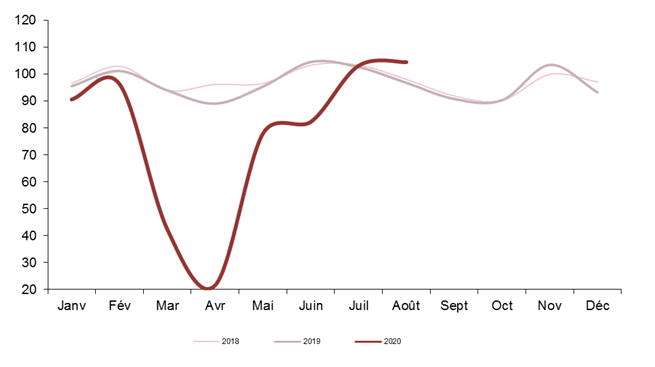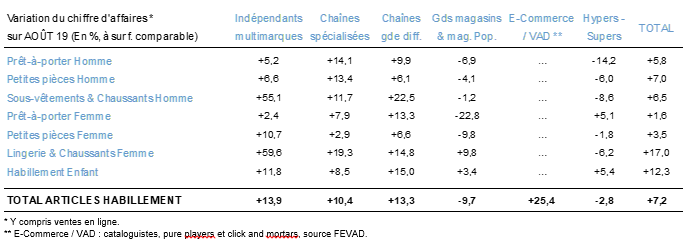 Les chiffres d’affaires habillement des distributeurs – ventes en ligne comprises – ont bénéficié, au mois d’août, d’une hausse de 7,2 % par rapport à août 2019. L’effet calendaire du décalage des soldes, qui ont eu lieu du 15 juillet au 11 août cette année, a contribué à soutenir les ventes de juillet et août 2020. En outre, l’activité commerciale a été favorisée au mois d’août par une météo très estivale et l’affluence des touristes français.