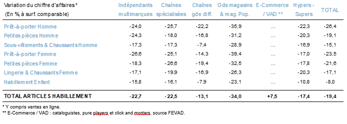 Pour la période janvier-août 2020, les chiffres d’affaires habillement des distributeurs ont subi une baisse de 19,4 % en valeur par rapport à la même période de l’année 2019. La nette amélioration des résultats des mois de juillet et août a permis de limiter quelque peu la baisse du cumul annuel. En revanche, les premiers éléments d’information sur le mois de septembre font état d’une dégradation de l’activité commerciale.
