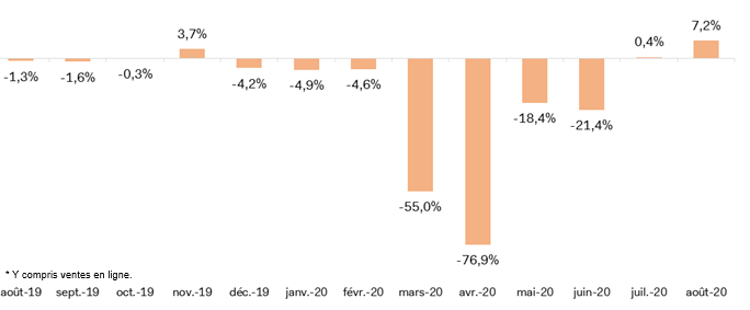 Évolutions mensuelles des ventes d’habillement d’août 2019 à août 2020