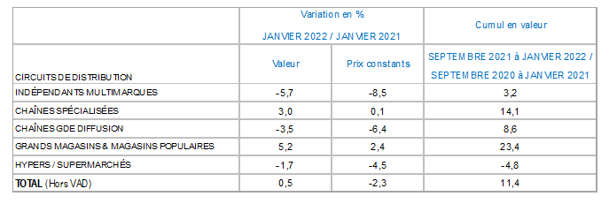 Les évolutions du premier mois de l’année sont contrastées selon les circuits de distribution ; elles sont comprises entre une croissance de 5,2 % pour les grands magasins (magasins populaires inclus) et un recul de 5,7 % pour les indépendants multimarques.