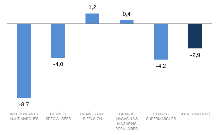 Pour les dix premiers mois de l’année 2022, les chiffres d’affaires des distributeurs (hors VAD) sont supérieurs de 8,4 % à ceux de la même période de 2021 mais ils restent cependant en retrait des niveaux de 2019 (- 6,7 %).