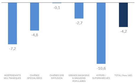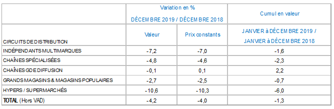 Les résultats du dernier mois de l’année sont compris entre un repli des ventes de 0,1 % pour les chaînes grande diffusion et une baisse de 10,6 % pour les hypers et supermarchés.