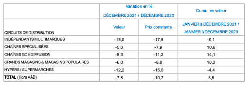 Décembre 2021 : recul de 7,8 % par rapport à 2020, hausse de 5,7 % par rapport à 2019