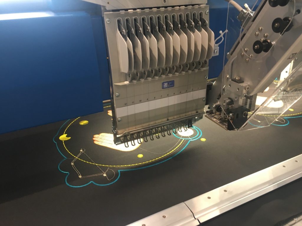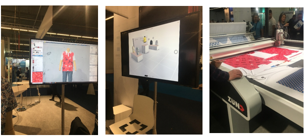 La micro factory textile rassemblait trois chaines intégrales dont l’une était consacrée à la mode et représentait 4 étapes (design 3D – CAO, impression, coupe et assemblage) d’une production digitalisée. Les partenaires de cette ligne de production représentés à chaque étape étaient : Assyst (CA0 et design 3D), VuFrame (simulation des vêtements en réalité augmentée et réalité virtuelle), Caddon (management de la couleur), Ergosoft (traitement d’image), Mimaki (impression numérique), Multi-plot (sublimation), Zünd (coupe) et Juki (assemblage).
