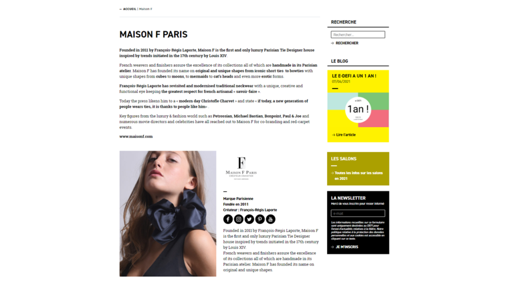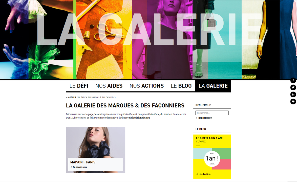 - Envoyez un mail à defi@recette.defimode.org en précisant comme objet « DEFI – Galerie des marques », en exprimant votre souhait d’intégrer la galerie et en donnant votre numéro SIREN ainsi qu’une adresse mail valide qui vous servira d’identifiant.
