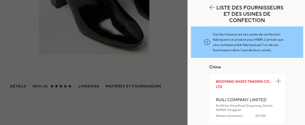 Voilà un changement qui aurait pu passer inaperçu et qui est pourtant très révélateur du re-positionnement de l’enseigne H&M. Il s’agit d’un nouvel onglet apparu dans les pages produits de son site Internet. Intitulé “Product Sustainability” (ou “Matières et fournisseurs” sur le site français), il permet d’accéder aux informations concernant l’origine des articles vendus en ligne. En particulier, la marque suédoise s’engage à indiquer la source des matières premières et l’adresse des usines où sont fabriqués les produits. Elle réaffirme ainsi ses engagements en matière de durabilité, notamment en ce qui concerne les conditions de travail des employés.