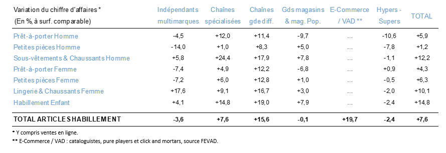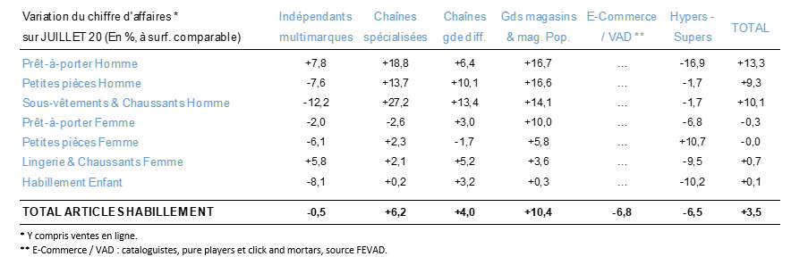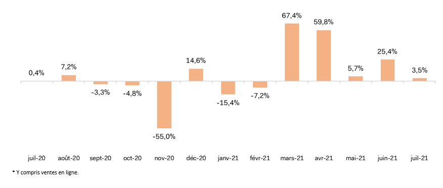 Le mois de juillet a bénéficié cette année d’un effet calendaire positif du fait du décalage des soldes (les soldes d’été ayant débuté cette année le 30 juin, alors que l’année dernière ils avaient commencé le 15 juillet). Pour l’ensemble des circuits de distribution, les chiffres d’affaires de juillet 2021 sont supérieurs à ceux de juillet 2019 : + 3,9 %.