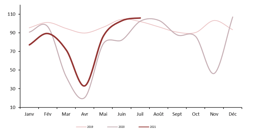 Selon notre scénario médian, le bilan de l’année 2021 devrait s’établir à environ + 5 % par rapport à 2020, soit – 11 % par rapport à 2019.
