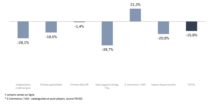 Au total, pour les sept premiers mois de l’année 2021, les ventes d’habillement ont enregistré une hausse de 7,6 % en valeur par rapport à la même période de 2020 mais elles restent très en retrait par rapport aux sept premiers mois de l’année 2019 (- 15,8 %).