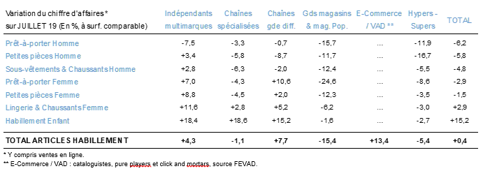 Les chiffres d’affaires habillement des distributeurs – ventes en ligne comprises – ont connu une légère hausse au cours du mois de juillet (+ 0,4 % en valeur, par rapport à juillet 2019). La première semaine de soldes, à partir du 15 juillet, a contribué à soutenir quelque peu les ventes de juillet cette année, alors que les soldes avaient débuté le 26 juin en 2019.