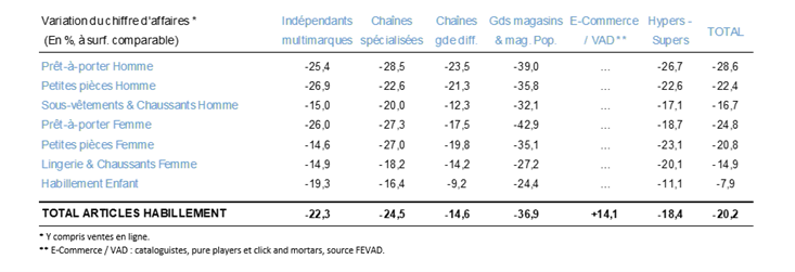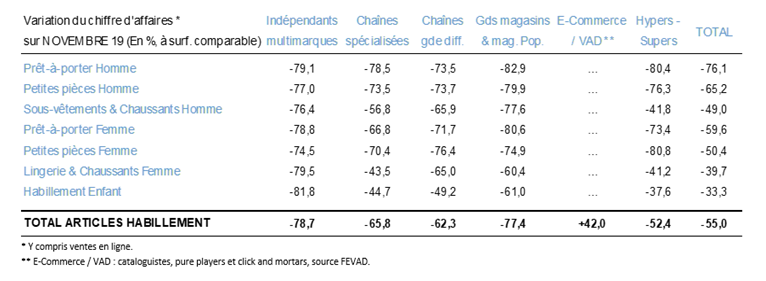 Pour la période janvier-novembre 2020, les chiffres d’affaires habillement des distributeurs ont chuté de 20,2 % en valeur par rapport à la même période de l’année 2019. Les résultats du mois de décembre, qui pourraient être positifs, devraient permettre d’améliorer ce résultat. In fine, le bilan de l’année 2020 devrait être plus proche d’un recul de 17 % que de 20 %, ce qui correspond à un résultat légèrement moins dégradé qu’anticipé.