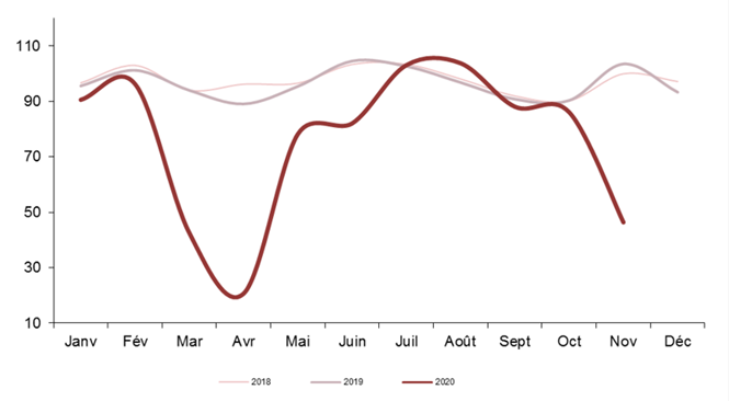 Le dynamisme des ventes en ligne a été très soutenu en novembre (+ 63,1 % par rapport à novembre 2019), alors que l’activité commerciale des points de vente physiques a subi un retrait de 75,0 %. Au cours des onze premiers mois de l’année 2020, pour l’ensemble des circuits de distribution, les ventes en ligne ont enregistré une croissance de 19,9 % en valeur par rapport à la même période de 2019. On rappellera qu’en 2019, la hausse du commerce en ligne n’avait été que de 3,2 %. Les points de vente physiques, quant à eux, ont vu leurs ventes chuter de 26,1 % au cours des onze premiers mois de l’année.
