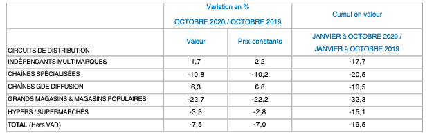 Pour les dix premiers mois de l’année, le bilan provisoire des ventes affiche un recul de 19,5 %, hors VAD. La mise en place d’un nouveau confinement a sensiblement dégradé les perspectives pour la fin de l’année ; le mois de novembre devrait enregistrer un fort repli de l’activité commerciale, par rapport à novembre 2019.