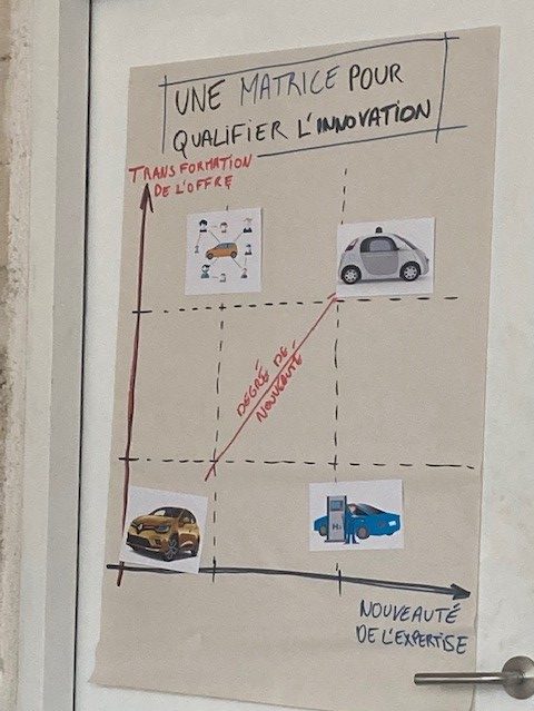 Dans un premier temps, Simon Martin a demandé aux participants de placer des projets sur une matrice afin de qualifier leur caractère innovant. L’axe des abscisses correspond à la nouveauté de l’expertise (de l’approfondissement marginal de l’expertise historique à une nouvelle expertise éloignée de l’expertise historique) tandis que l’axe des ordonnées correspond à la transformation de l’offre (de l’optimisation de la proposition de valeur historique à une nouvelle proposition de valeur répondant à de nouveaux besoins ou marchés).