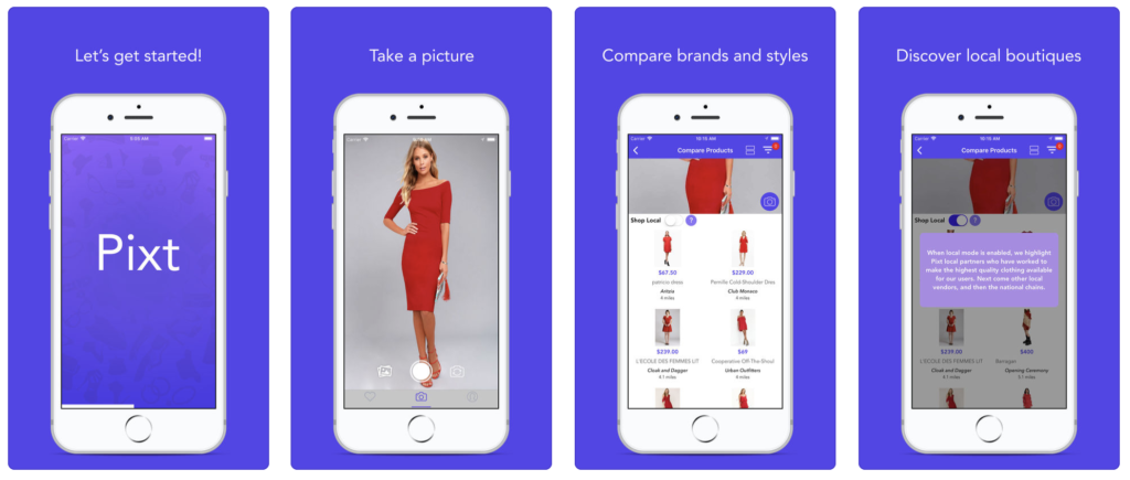 PIXT est une application de mode basée à New York. La plateforme permet aux acheteurs de découvrir des vêtements spécifiques disponibles dans des boutiques locales : en téléchargeant ou en prenant une photo, l’utilisateur peut trouver des styles similaires à ceux qu’il recherche, le tout dans des magasins de proximité. Une connexion entre acheteurs et boutiques locales rendue possible par le Machine Learning (ou apprentissage automatique) et la vision assistée par ordinateur.