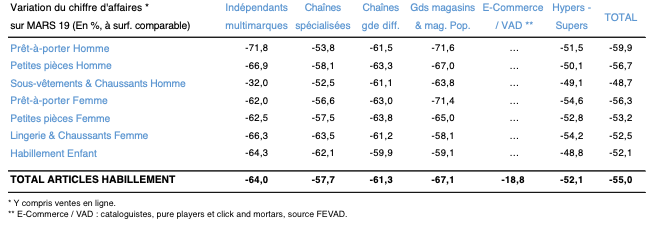 Pour l’ensemble des circuits de distribution, les chiffres d’affaires habillement – ventes en ligne comprises – ont chuté de 55,0 % au cours du troisième mois de l’année.