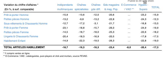 L’activité des distributeurs a été paralysée par la fermeture inédite des points de vente à la suite de la mise en place des mesures de confinement du 17 mars. Si les magasins à dominante alimentaire ont pu continuer à vendre des vêtements, à l’image de Monoprix et des hypermarchés, les consommateurs ont privilégié les « achats de première nécessité ». Tous les circuits de distribution ont été touchés par le recul drastique de l’activité commerciale au mois de mars et les ventes en ligne n’ont pas été épargnées : – 17 % en moyenne pour l’ensemble des circuits de distribution.