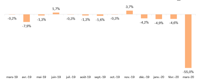 Les ventes ont chuté de 55 % en mars 2020 par rapport à mars 2019.
