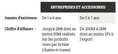 Il sera de 1 250€ si l’entreprise a un CA en chaine et trame inférieur à 60% et/ou s’il n’y a aucune fabrication en France.