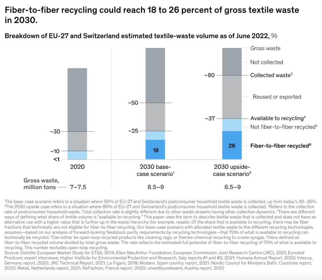 En surmontant ces obstacles, McKinsey estime que le recyclage fibre à fibre pourrait représenter 26% des déchets textile en 2030.