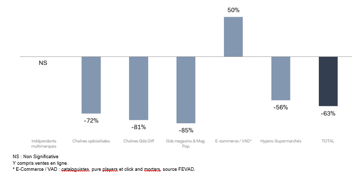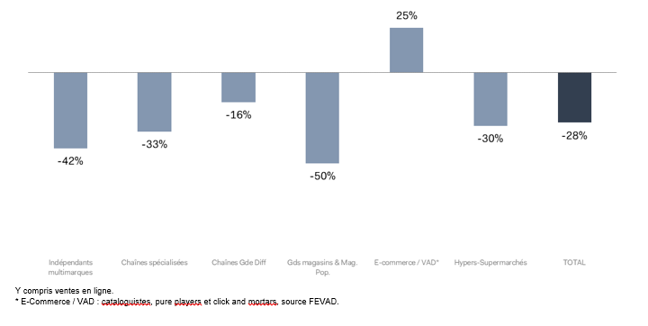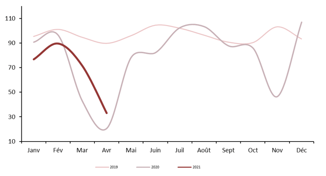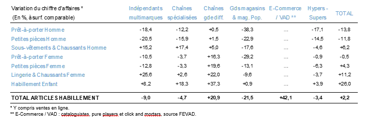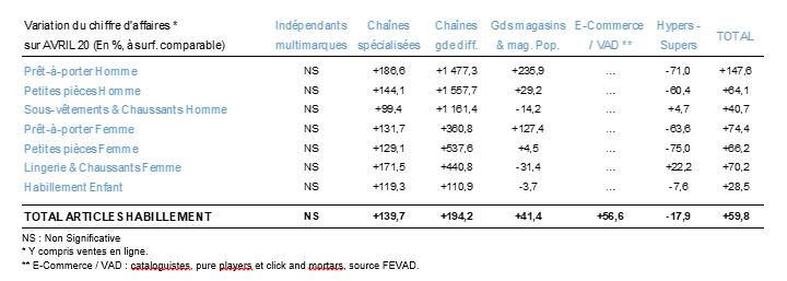 Au total, pour les quatre premiers mois de l’année 2021, les ventes habillement ont bénéficié d’une hausse de 2,2 % en valeur par rapport à la même période de 2020 mais elles restent très en retrait par rapport aux quatre premiers mois de l’année 2019 (- 28 %).