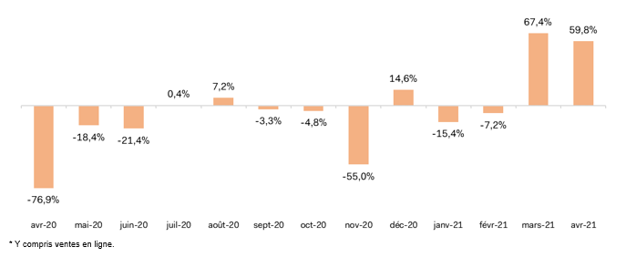 La hausse des ventes en ligne a été soutenue en avril (+ 61,5 % par rapport à avril 2020). En avril 2020, elles avaient également progressé mais à un rythme moindre : + 22,0 % par rapport à avril 2019.