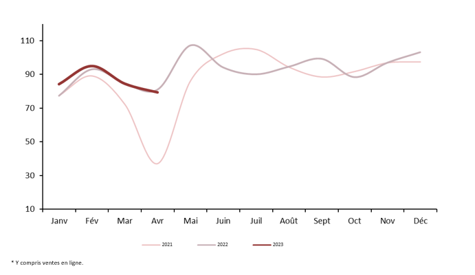 Pour la période janvier-avril 2023, les ventes en ligne de l’ensemble des circuits de distribution sont inférieures de 4,3 % à celles de la même période de 2022, tandis que l’activité commerciale des points de vente a bénéficié d’une croissance de 5,7 %.