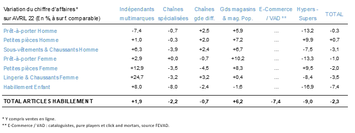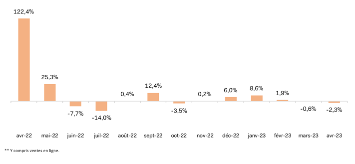 Évolutions mensuelles des ventes d’habillement d’avril 2022 à avril 2023