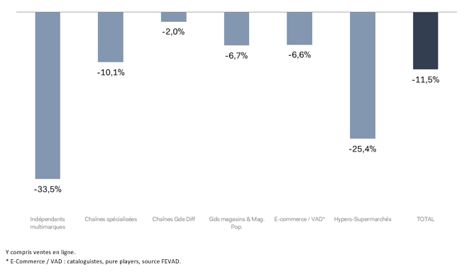 Les résultats définitifs du mois d’avril 2023 indiquent une baisse de 2,3 % des chiffres d’affaires habillement des distributeurs par rapport à avril 2022. Hormis les grands magasins (magasins populaires inclus) et les indépendants multimarques, tous les circuits de distribution ont subi un repli de leur activité commerciale. Par rapport à la situation pré-Covid, les chiffres d’affaires d’avril 2023 sont en recul de 14,7 % par rapport à avril 2019.