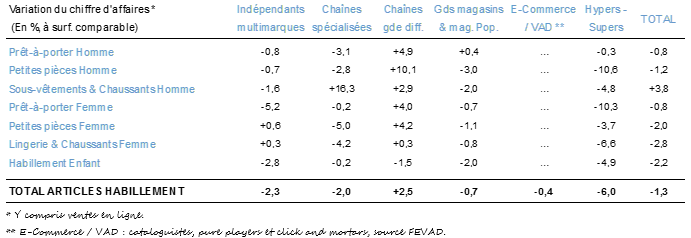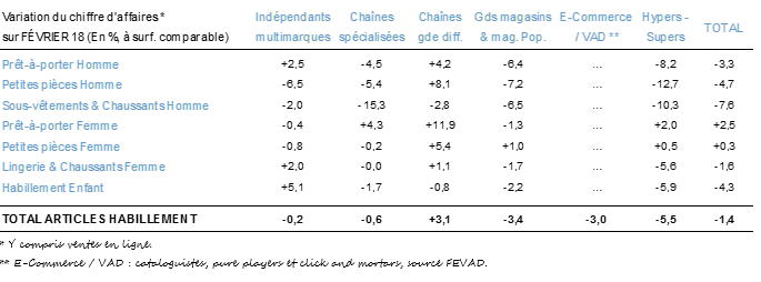 Les résultats du mois de février sont très contrastés et compris entre une hausse de 3,1 % pour les chaînes grande diffusion et un retrait de 6,6 % pour les hypers et supermarchés.