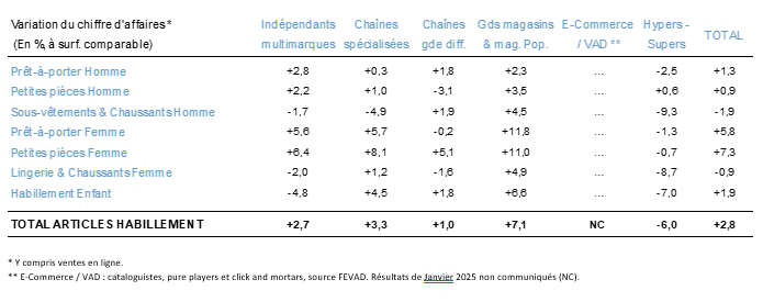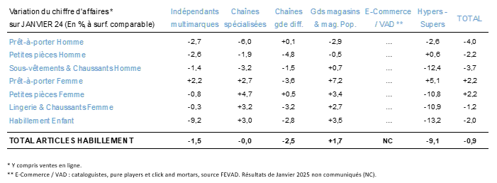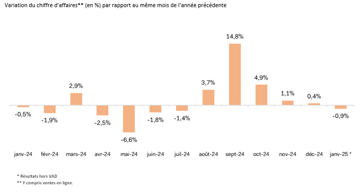 Pour la période septembre 2024-janvier 2025, les ventes d’articles d’habillement (hors VAD) sont supérieures de 2,8 % à celles de la période correspondante de l’année précédente.