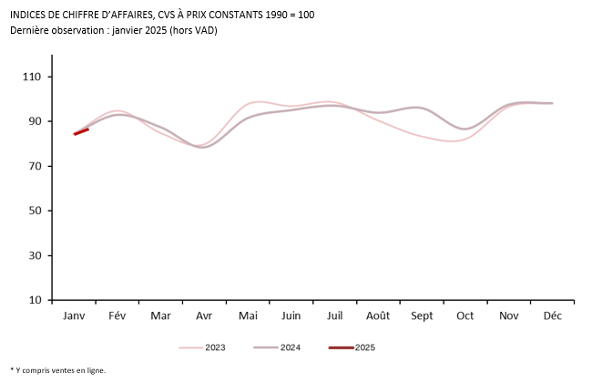 Les ventes en ligne (hors VAD) ont enregistré un gain de 2,6 %, tandis que les ventes des magasins physiques se sont repliées de 2,6 % par rapport à janvier 2024.