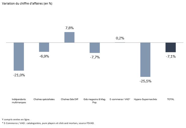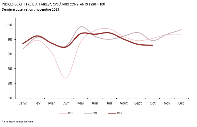 Pour la période janvier-novembre 2023, les ventes en ligne de l’ensemble des circuits de distribution sont inférieures de 3,9 % à celles de la même période de 2022, tandis que l’activité commerciale des points de vente est restée stable. La part des ventes en ligne devrait légèrement s’éroder en 2023 par rapport à l’année précédente (celle-ci était de 18 % en 2022), tout en restant supérieure à celle de 2019 (15 %).