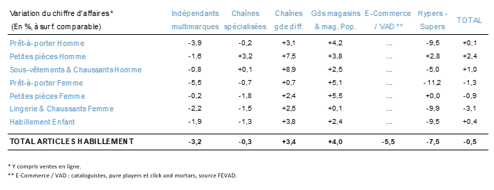 En valeur, les ventes habillement des onze premiers mois de l’année 2023 ont subi un léger repli de 0,5 % comparées à celles des onze premiers mois de 2022, ce qui correspond à un recul de 3,1 % à prix constants. L’activité commerciale de la période janvier-novembre 2023 reste toujours très en retrait par rapport à 2019 (- 7,1 % en valeur). Seules les chaînes grande diffusion ont enregistré un chiffre d’affaires supérieur de 7,8 % à celui des onze premiers mois de 2019.