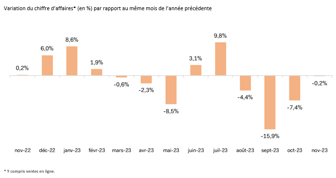 Évolutions mensuelles des ventes d’habillement de novembre 2022 à novembre 2023
