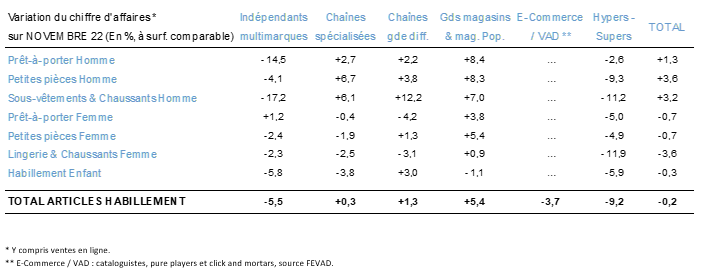 Les résultats définitifs du mois de novembre 2023 indiquent un recul de 0,2 % des chiffres d’affaires habillement des distributeurs par rapport à novembre 2022. Les résultats sont très contrastés selon les circuits de distribution et les hypers-supermarchés ont enregistré un recul prononcé de leur activité commerciale (-9,2 %), en dépit du Black Friday. A l’inverse, les grands magasins ont bénéficié d’une hausse de 5,4 % de leurs ventes (magasins populaires compris).