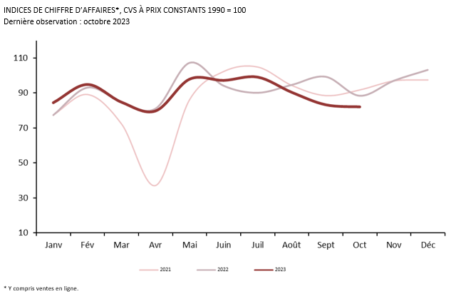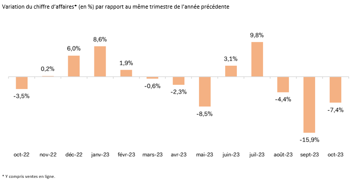 Résultats définitifs du mois d’octobre 2023 : chiffres d’affaires en recul de 7,4 % par rapport à octobre 2022