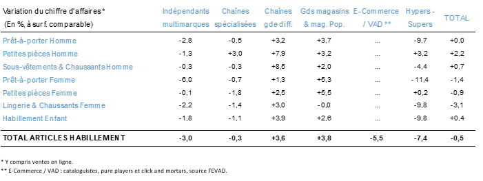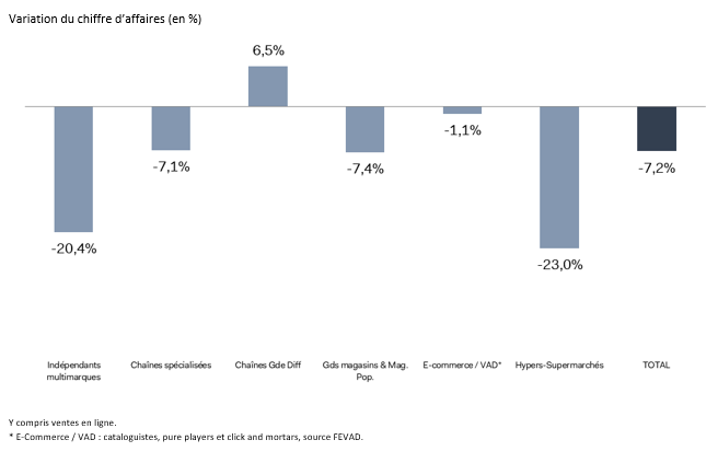 Évolution des ventes habillement par circuit janvier-octobre 2023 / janvier-octobre 2019