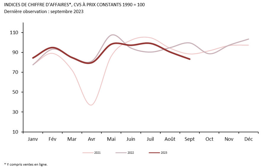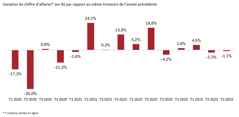 Les magasins physiques tout comme le commerce en ligne ont subi au mois de septembre un recul des ventes par rapport à 2022 (- 14,4 % pour les magasins physiques et – 20,7 % pour le commerce en ligne).