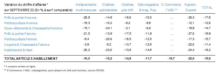 Les résultats définitifs du mois de septembre 2023 indiquent un fort recul de 15,9 % des chiffres d’affaires habillement des distributeurs par rapport à septembre 2022. Septembre 2023 a été le mois de septembre le plus chaud jamais mesuré en France métropolitaine, ce qui n’a pas favorisé les ventes. Il faut relativiser la forte chute des ventes de septembre, dans la mesure où la référence de septembre 2022 était très élevée, la baisse soudaine des températures avait soutenu l’activité commerciale l’année dernière.